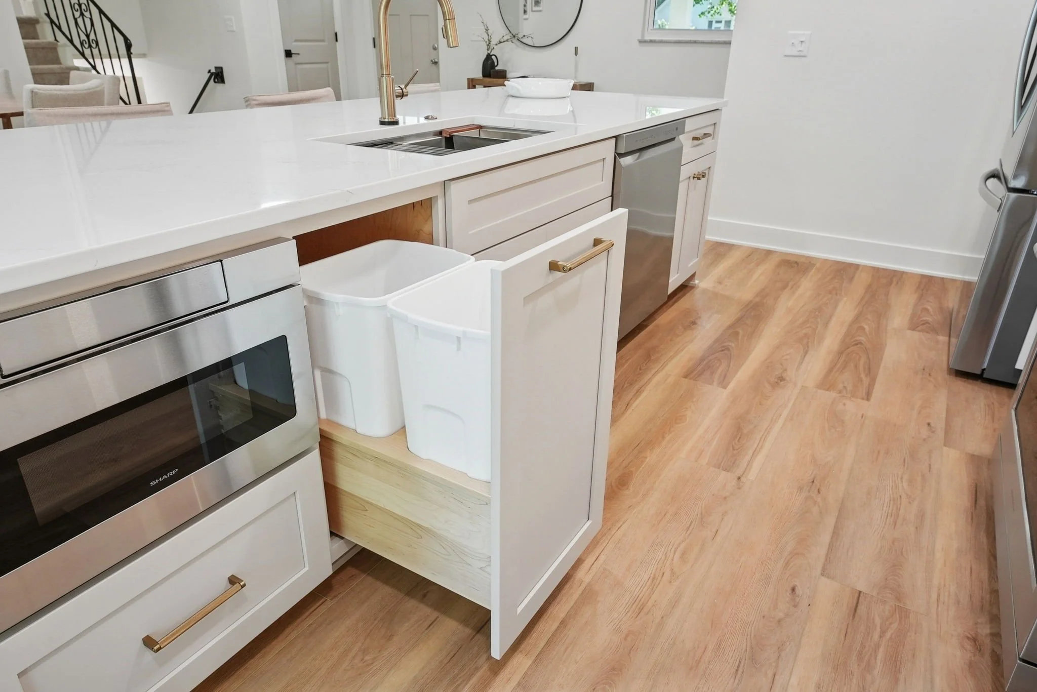 Pull‑outs for trash, recycling, pantry items, and spices.